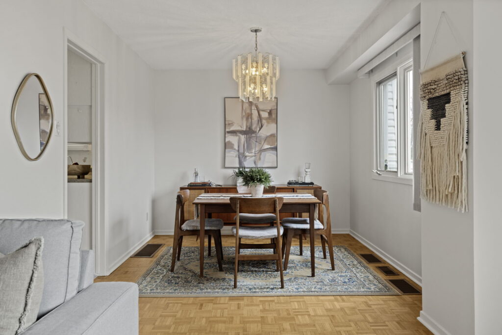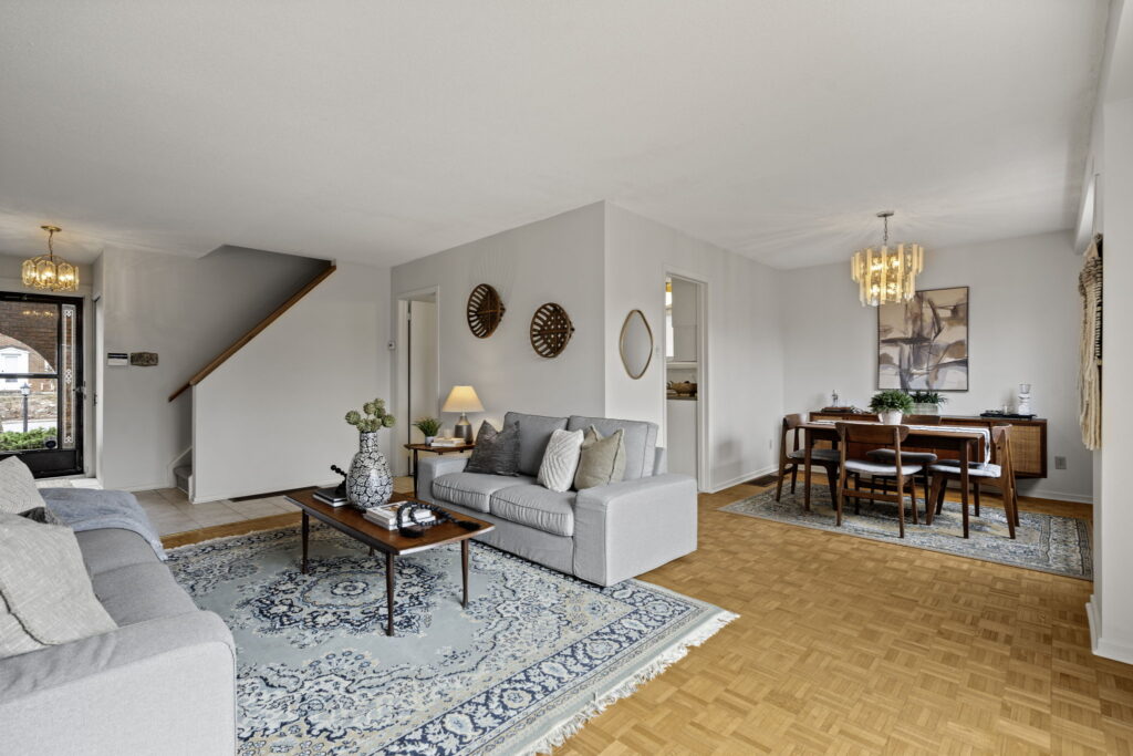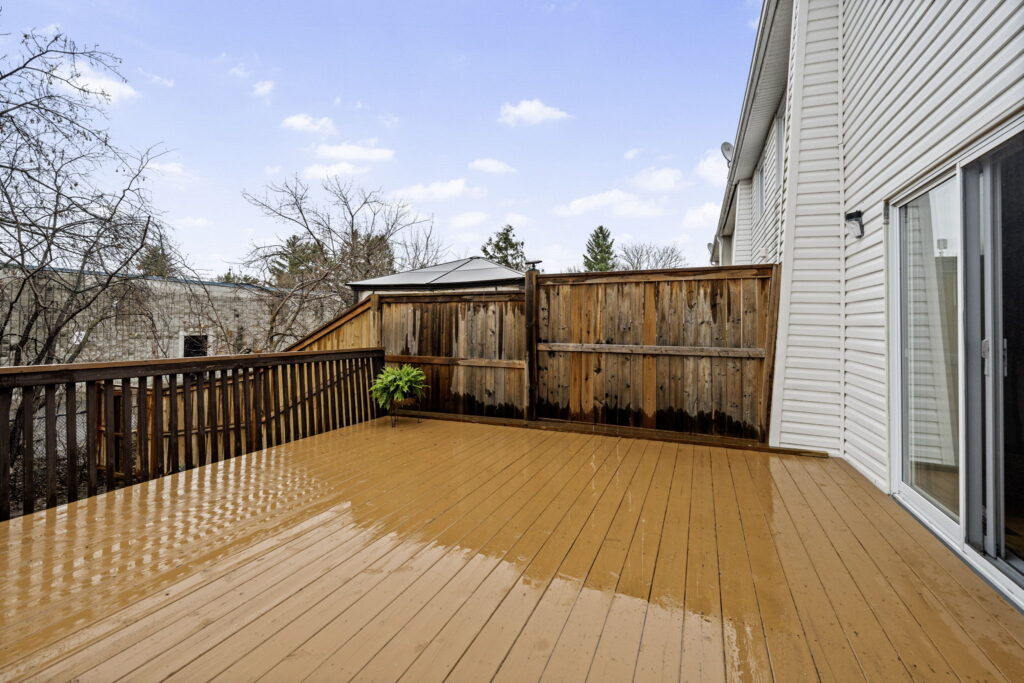 The main level flows easily from the front entry through to the living and dining areas, with refinished parquet hardwood throughout. Sliding patio doors off the living room open onto a 16×16 deck and a fully fenced backyard, making the transition from inside to outside feel natural.