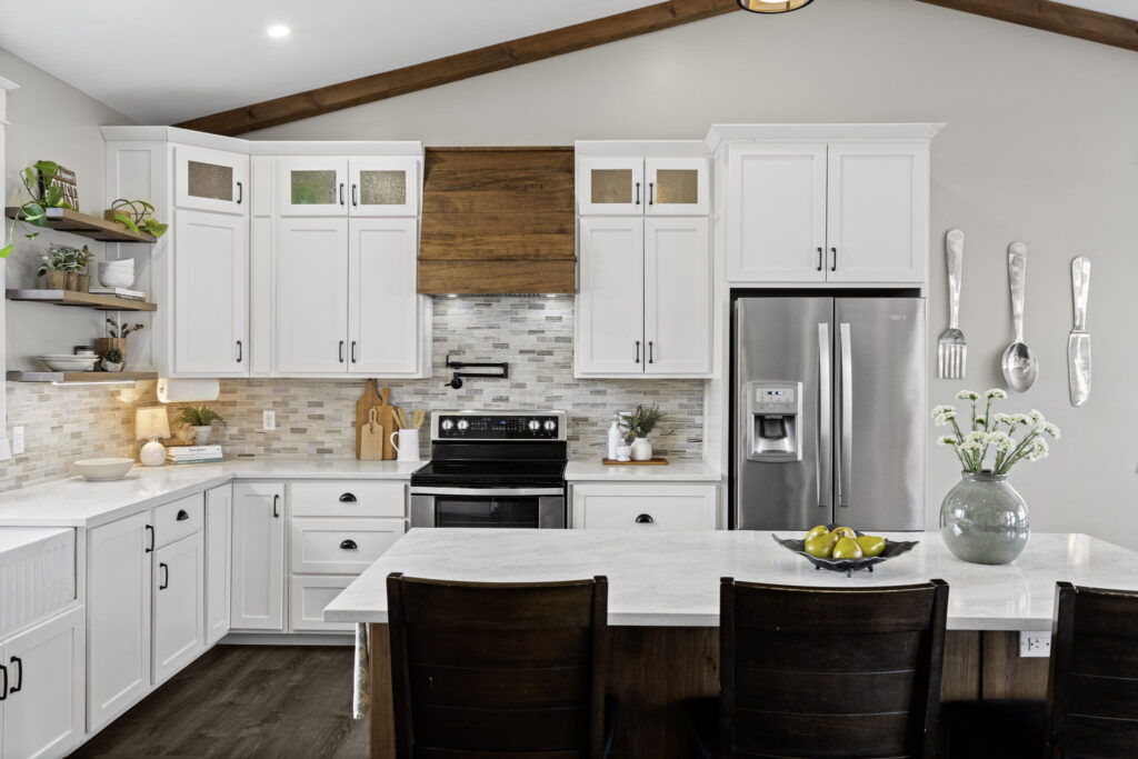 At the centre, the kitchen anchors everything. A large island with seating makes it a natural gathering spot, paired with quartz countertops, open shelving, and a walk-in pantry that keeps everything tucked away while hosting, but still within reach. Large windows frame the space, bringing in light and keeping that connection to the outdoors.